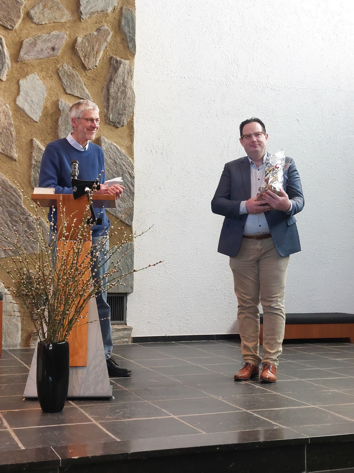 Als kleine blijk van waardering hebben we Fedor een cadeau gegeven met producten van het fruitbedrijf met de naam Heiland. Daarom kan ik [Henk Verkerk] zeggen dat dit een cadeau van de Heiland is. En dat cadeau is natuurlijk ook voor Thea bedoeld, die al die jaren achter je gestaan heeft.Fedor, nogmaals dank en zegen voor jou en Thea toegewenst.