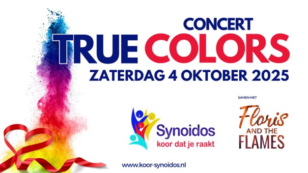 Koor Synoidos organiseert op zaterdag 4 oktober zijn volgende concert, 'True Colors', samen met de in Belgie als zeer bekende band 'Floris and the Flames'. De muziek die u gaat horen zal een aantal gemene delers hebben, zoals verbinding, liefde, respect, diversiteit en kleur. We zijn heel trots dat we dit concert weer samen met onze dirigente Nadia Loenders en pianiste Suzanne Welters gaan uitvoeren. We beginnen om half acht, en we treden op in 'Onger de 2 Tores' in Sanderbout, Sittard.