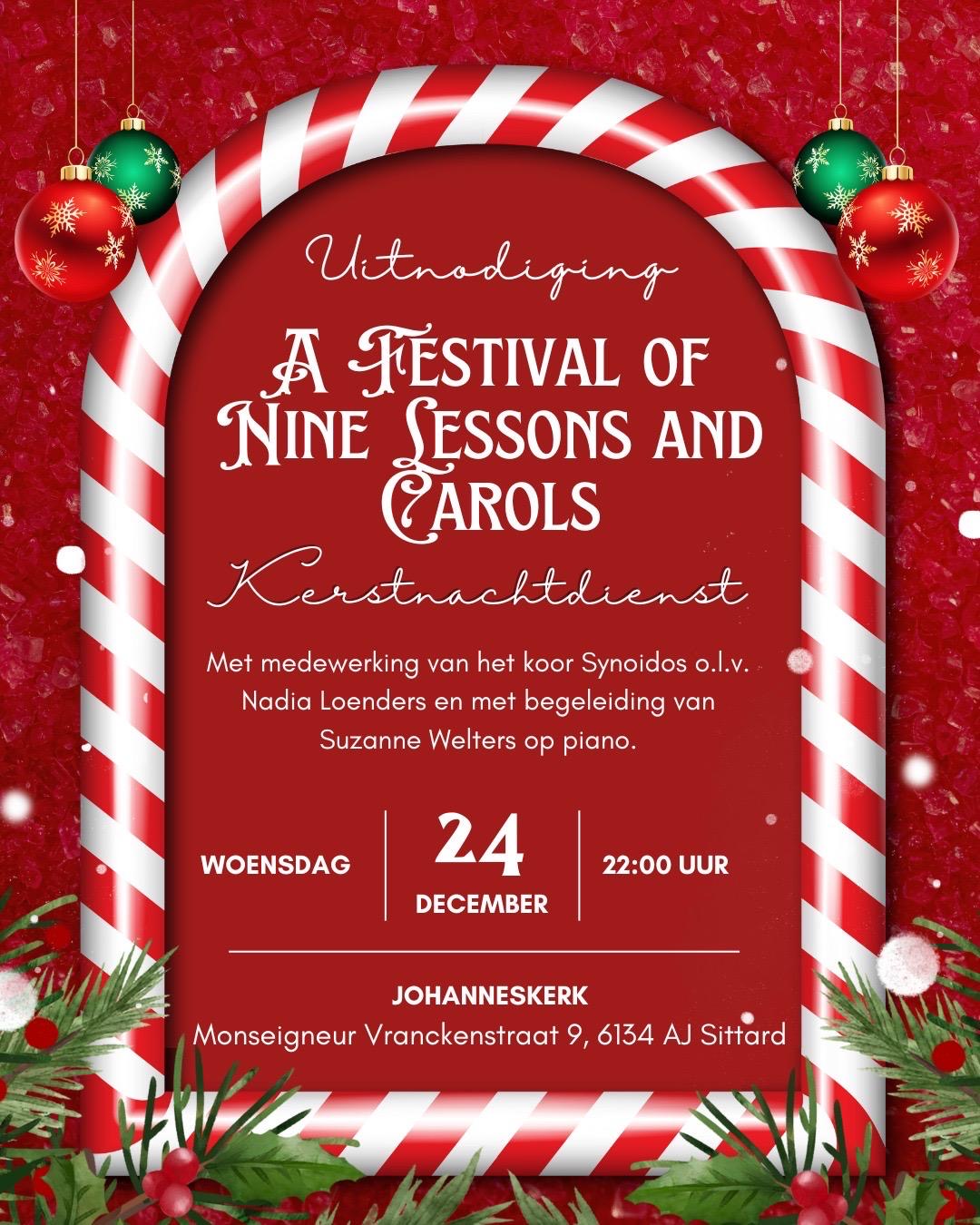 De kerstnachtdienst in de Johanneskerk te Sittard begint om 22.00 uur op 24 december. Ook dat belooft een bijzondere dienst te worden. We nodigen u uit voor een ‘Festival of Nine Lessons and Carols’ – een viering met negen lezingen en kerstliederen. Het is een vorm die geinspireerd is door Engelse kerst tradities. Het koor Synoidos onder leiding van Nadia Loenders zingt de carols waarbij ook kan worden meegezongen. Suzanne Welters begeleidt het zingen op de piano. Ds. Jolien Leeffers spreekt de gebeden uit. De negen lezingen worden verzorgd door negen verschillende lectoren - die allemaal een bepaalde groep uit onze gemeente vertegenwoordigen. Deze lezingen laten iets zien van de heilsgeschiedenis die in de kerstnacht uitmondt in de geboorte van Christus. Ook hier: nodig gerust buren, bekenden en familie uit voor dit speciale ‘festival’.