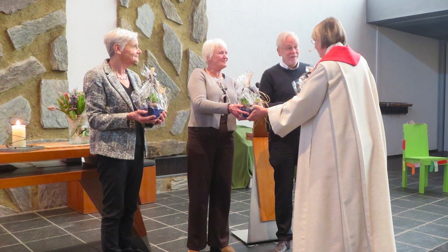Drie nieuwe ambtsdragers mochten vervolgens worden bevestigd. Dat zijn: Bert Kip (voorzitter College van Kerkrentmeesters), Editha van Rheenen (secretaris College van Kerkrentmeesters en Irene van Gurp (ouderling Pastoraat). Daarmee zijn de drie plekken weer ingevuld wat de gemeente tot dankbaarheid stemt. De nieuwe ambtsdragers kregen voorjaarsbloemen als welkomstgeschenk.
