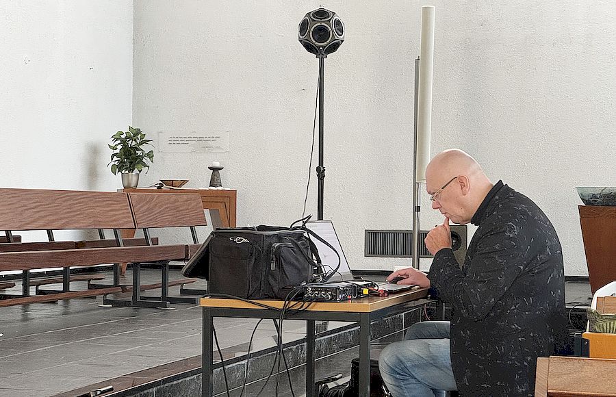 Jan Bril, senior adviseur akoestiek van ‘het geluidBuro’, had een kofferbak vol apparatuur meegebracht. Na opstelling daarvan en een korte uitleg over het hoe en waarom van de metingen ging hij aan de slag in de verwarmde kerkzaal. Eerst mocht Klaas Remerie, organist van de Sint Jan in Maastricht en adviseur van de orgelcommissie, in ruim vijf minuten laten horen wat het huidige orgel allemaal kan. Daarna begonnen de vele metingen met een speciale geluidsbron en opname microfoon. Alles conform specifieke normen en volgens een vast patroon. Met microfoons in de vorm van een ‘digitaal hoofd’ werd vastgelegd hoe een gemiddelde kerkganger het geluid ervaart. Alles gebeurde onder toezicht van Eric Steenwijk, die ook nu weer opnames maakte voor een film over het totale ‘project orgelverplaatsing’.Na een korte nabespreking en een kop koffie vertrok Jan Bril ruim tweeënhalf uur na aankomst weer huiswaarts. Hij verwacht zijn rapport in januari 2026 op te leveren.