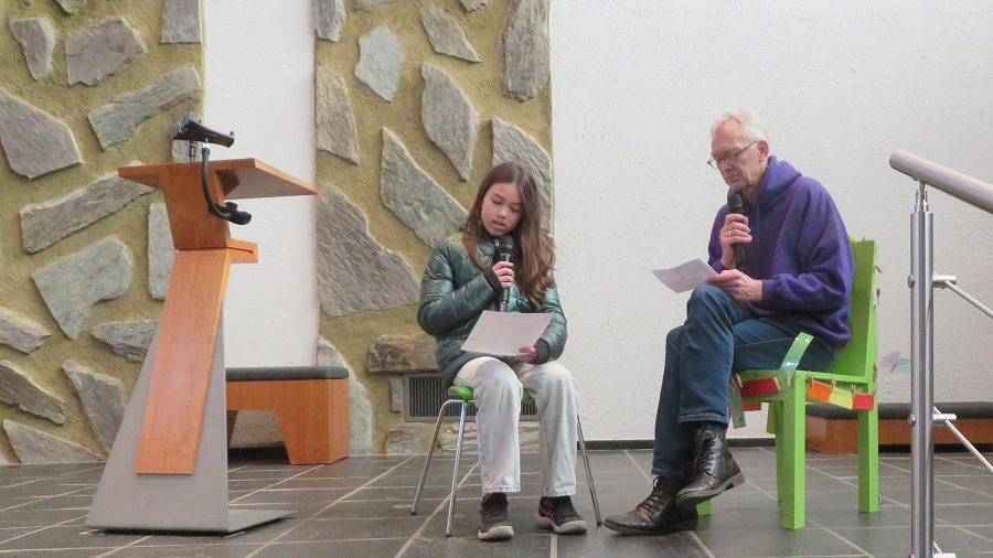 Shengmei vertegenwoordigde de generatie van de toekomst en stelde vragen aan Bert, die in zijn werk te maken heeft met het milieu. Eén van haar vragen luidde: “Dit is maar voor één uurtje; daar redt de wereld het toch niet mee?” Bert legde uit hoe we als kerk en persoonlijk kunnen zorgdragen voor het klimaat. “Op de website van de kerk kun je de knop ‘Meedoen’ aanklikken, vervolgens ‘Groene Kerk’ en zo kom je terecht bij allemaal ideeën voor milieubewust leven”.