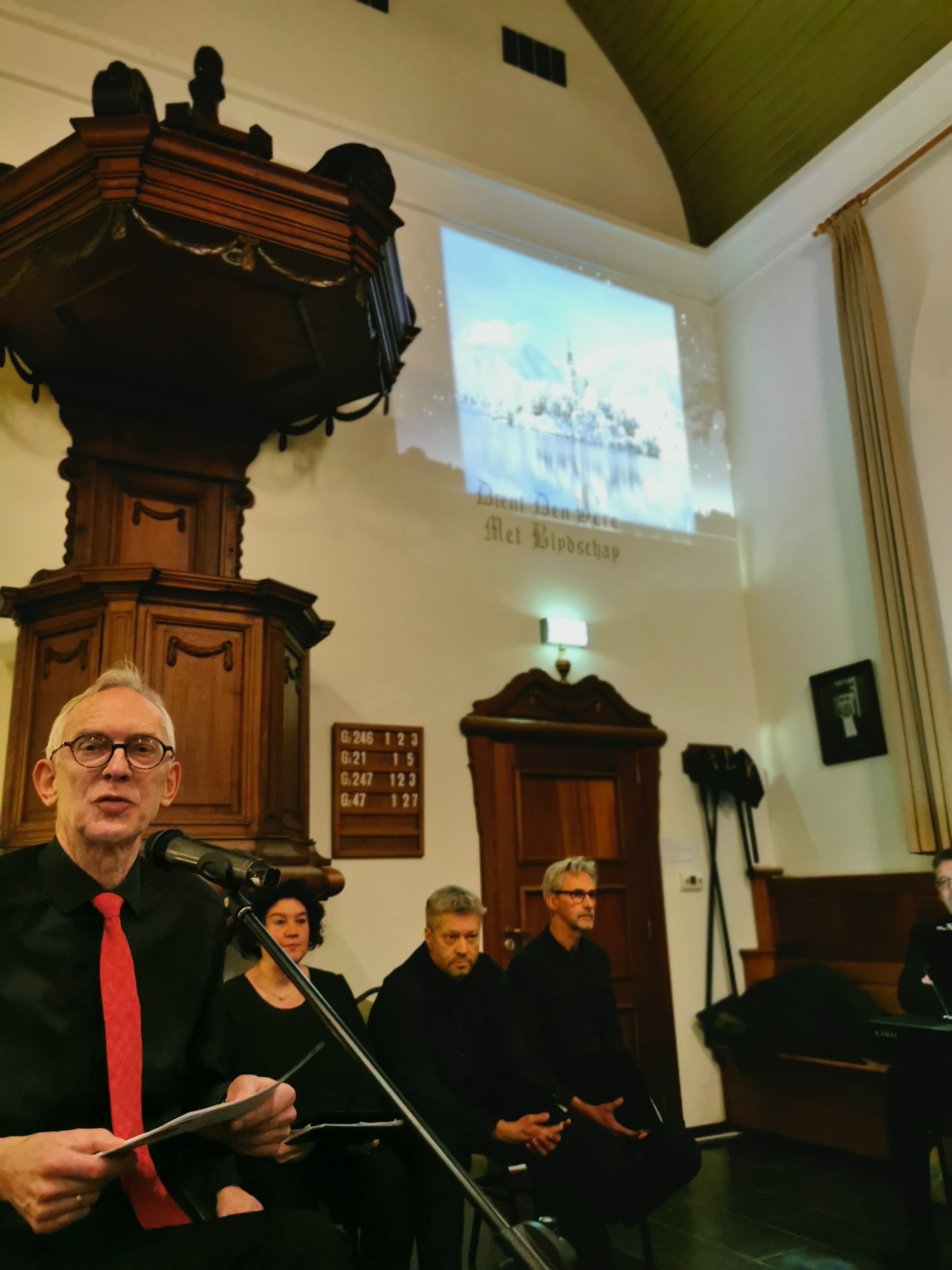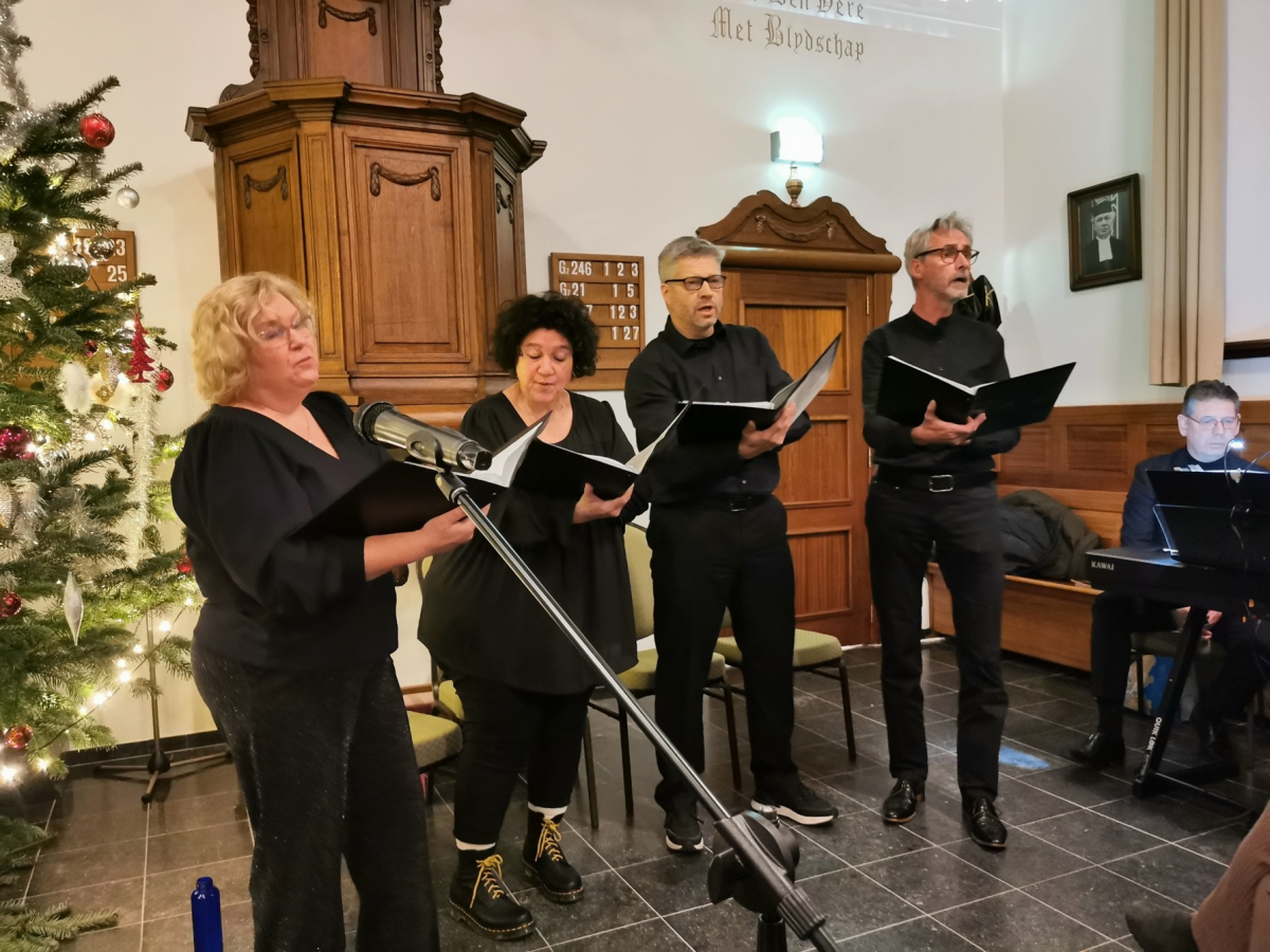 Op de laatste zondag voor kerst vertelde Bert Stuij het kerstverhaal ‘de klok van de pelgrim’ in het afgeladen podiumkerkje van Grevenbicht. Er was prachtige muziek van een zangkwartet, dat werd begeleid door Suzanne Welters op piano. De toegang was gratis, maar er kon wel ‘vrije gave’ gegeven worden voor Vluchtelingenwerk Nederland, en dan speciaal voor het werk dat vanuit de Ontmoetingskerk in Geleen wordt georganiseerd. We konden het mooie bedrag van € 750 aan hen overmaken.