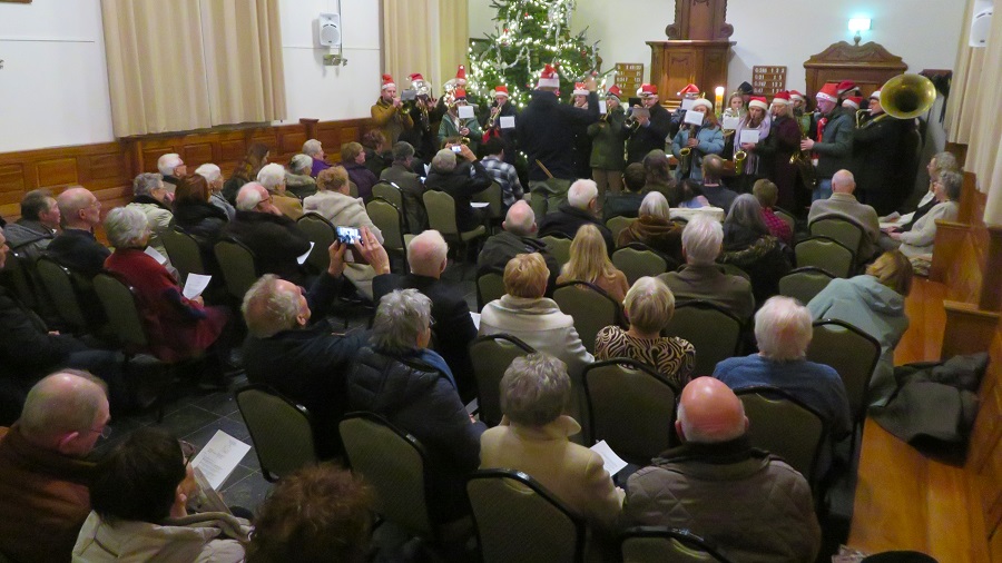 Dat begon om half acht in het Podiumkerkje in Grevenbicht met de medewerking van een gelegenheidsfanfare die in vrolijke kerstkledij onder andere het lied ‘Komt allen tezamen’ begeleidde. (zie foto boven dit bericht) Daarna vertrokken ze weer op hun tour door het dorp. De dienst werd geleid door Marian Knetemann. Christel Prins verzorgde de lezingen en Annie Niessen begeleide de samenzang op orgel. Na afloop was er chocolademelk, glühwein, chocolade en kerstkransjes.