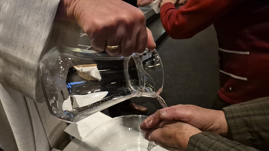Op Witte Donderdag starten we met het Taizélied ‘Blijf bij mij en waak hier met mij.’ Jolien schetst het beeld van zaad, dat moet sterven om leven door te geven en van brood, dat gedeeld wordt. We lezen Exodus 12 en Johannes 13 over het Pesachmaal. Jezus start het Paasmaal met het wassen van de voeten. Jolien wast onze handen. In de kring krijgen vieren we het Avondmaal, net zoals Jezus dit deed met zijn leerlingen. We verlaten in stilte de kerk.