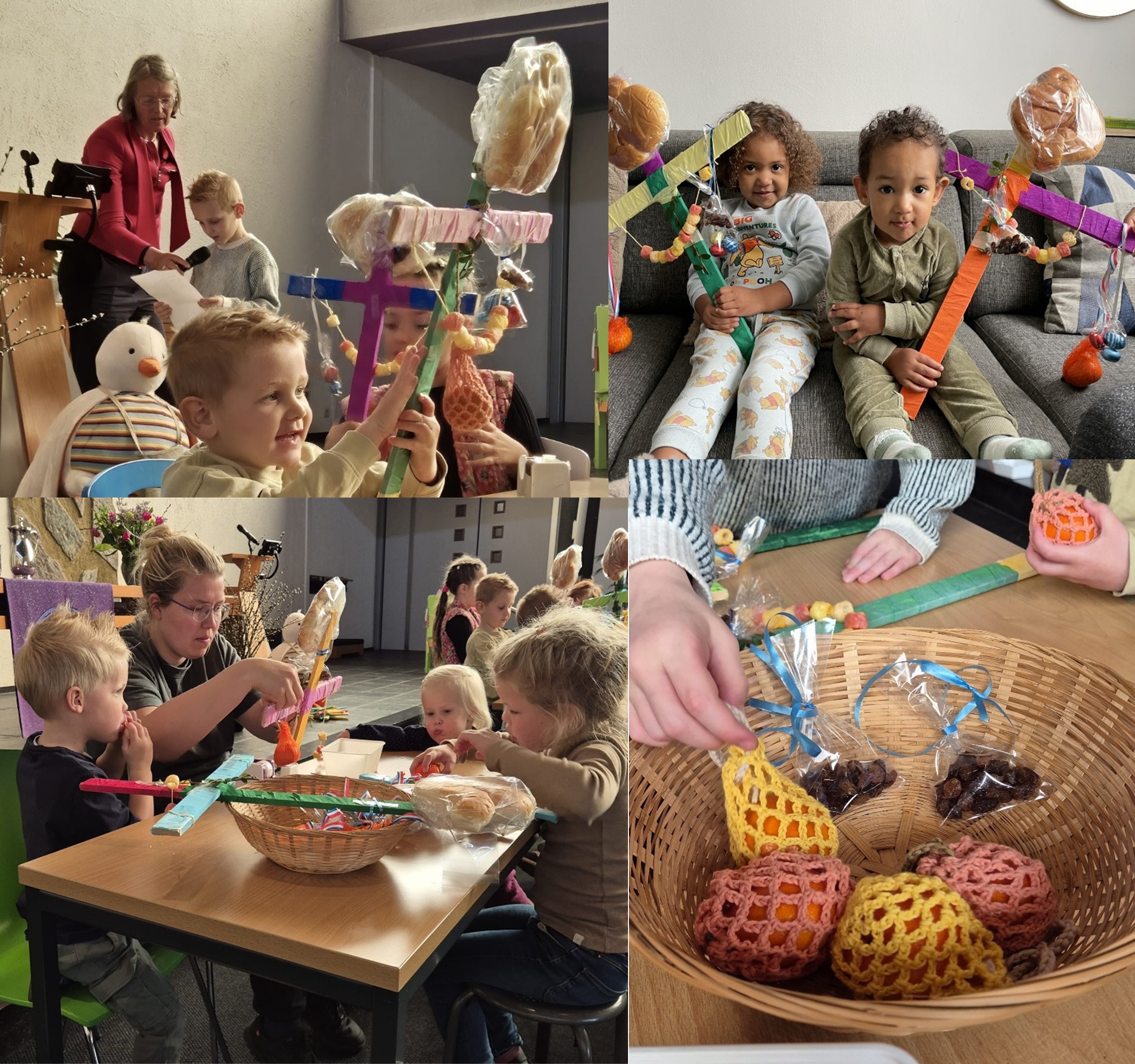 Een slinger met 11 chipjes stelde de leerlingen van Jezus voor. Judas was daar niet bij. Hij had Jezus verraden voor 30 geldstukken en daarom hingen een zakje met 30 rozijnen aan de stok. Boven op het kruis plaatsten we een haantje van brood. Het brood hoort bij het laatste avondmaal dat Jezus met zijn leerlingen vierde. En de haan hoort bij Petrus die drie keer zei dat hij Jezus niet kende, waarna de haan kraaide. Ook werd er een mandarijn opgehangen, de zure smaak past bij het lijden van Jezus vlak voordat hij stierf aan het kruis. Dat was verdrietig, maar tot slot hingen we chocolade eitjes aan het kruis, want eieren staan voor nieuw leven. Op Pasen stond Jezus op uit de dood, en zo mogen ook wij leven met Hem.