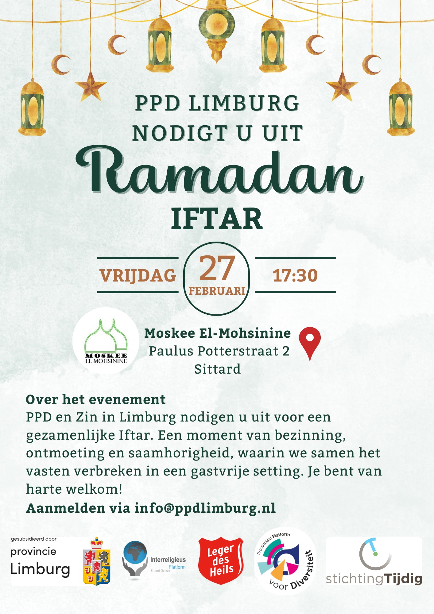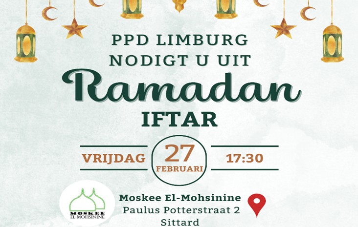 Het Provinciaal Platform Diversiteit van Limburg en Zin in Limburg nodigen u uit voor een gezamenlijke Iftar. Een moment van bezinning, ontmoeting en saamhorigheid, waarin we samen het vasten verbreken in een gastvrije setting. Je bent van harte welkom.