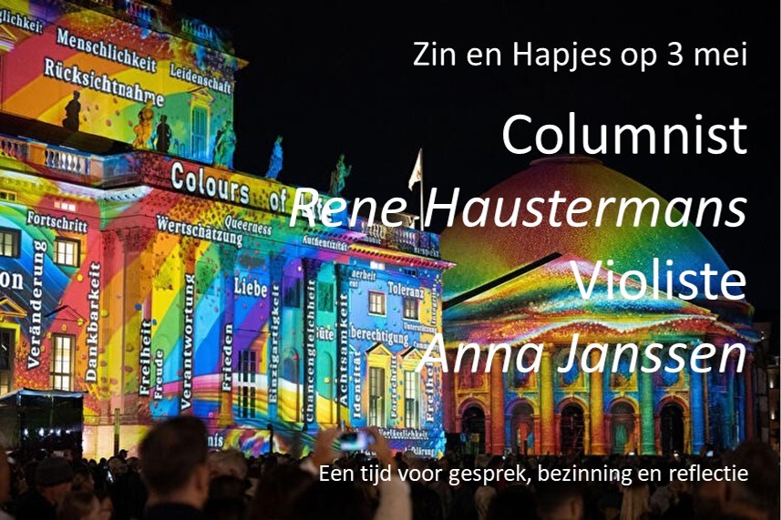 Op 3 mei is het de volgende zin en hapjes van het seizoen. Onze columnist is deze keer Rene Haustermans. Voor zijn column liet hij zich inspireren door dit bijzondere moment in het jaar - vlak voor de doden herdenking van 4 mei, en midden tussen de feesten van koningsdag en bevrijdingsdag in. Een column in een tijd waarin we snakken naar vrede, en misschien wel evenzeer verlangen naar oprecht kunnen vieren. De muziek wordt verzorgd door Anna Janssen, die zich als violiste onder meer laat inspireren door Joodse Klezmer muziek. Joodse volksmuziek die ook klonk in tijden waren de jodenvervolging heftig was.