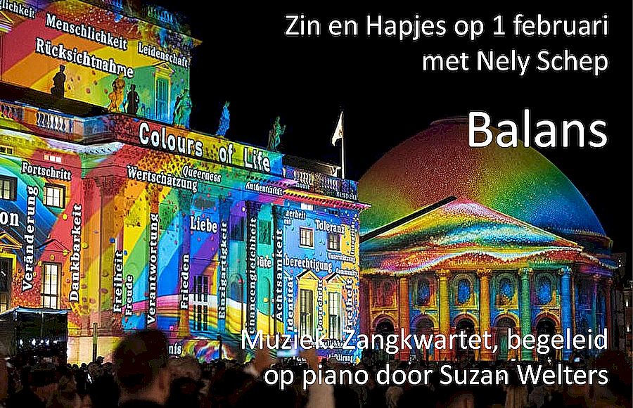 We gaan dit jaar verder met het thema ‘colours of life’, woorden die kleur aan het leven geven. Het woord van deze middag is ‘balans’. We zijn heel blij dat Nely Schep hierover de column wil uitspreken. Nely voelt zich zeer met dit woord verbonden, als was het alleen al omdat zij als Pilates docente werkt vanuit haar bedrijf 'SchepBalans'. Balans heeft zowel een lichamelijke als geestelijke dimensie, en beiden gaan Nely aan het hart.
